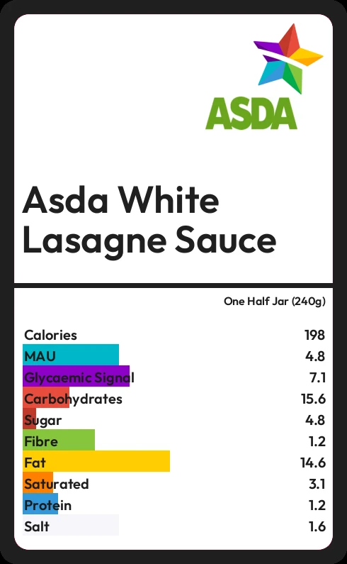 Asda White Lasagne Sauce contains 199.2 calories in one Half Jar (240g).