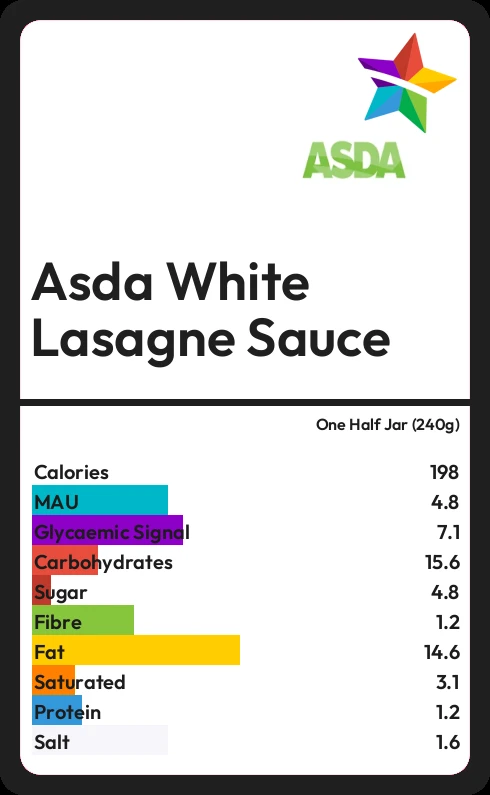 In one Half Jar (240g) of Asda White Lasagne Sauce there are 14.6g of fat of which 3.1g are saturated.