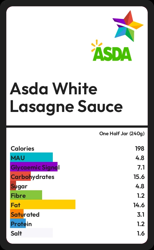 Asda White Lasagne Sauce contains 199.2 calories in one Half Jar (240g).