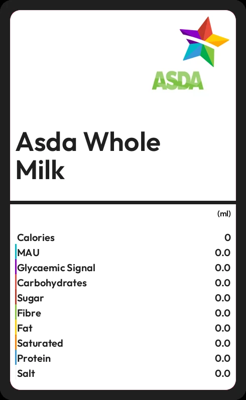 In 100ml of Asda Whole Milk there are 3.6g of fat of which 2.3g are saturated.