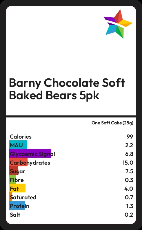 Barny Chocolate Soft Baked Bears 5pk contains 7.5g sugar in one Soft Cake (25g) - that is around 2 cubes of sugar.