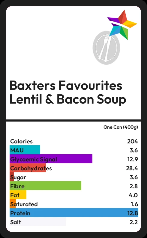 Baxters Favourites Lentil & Bacon Soup contains 204 calories in one Can (400g).