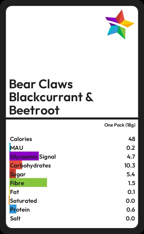 Bear Claws Blackcurrant & Beetroot contains 47.7 calories in one Pack (18g).