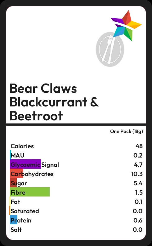 Bear Claws Blackcurrant & Beetroot contains 47.7 calories in one Pack (18g).