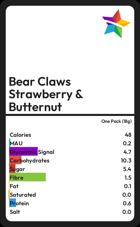 Bear Claws Strawberry & Butternut contains 47.7 calories in one Pack (18g).