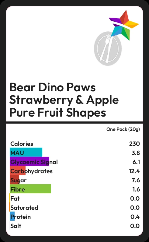 Bear Dino Paws Strawberry & Apple Pure Fruit Shapes contains 7.6g sugar in one Pack (20g) - that is around 2 cubes of sugar.