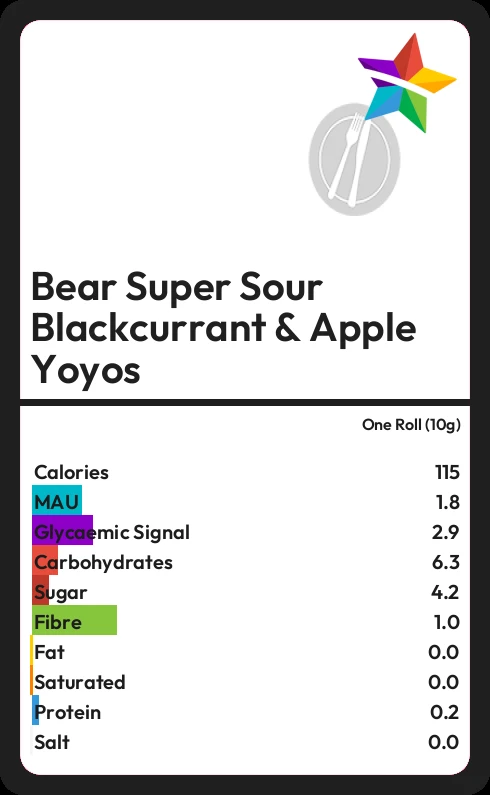 Bear Super Sour Blackcurrant & Apple Yoyos contains 4.2g sugar in one Roll (10g) - that is around 1 cube of sugar.