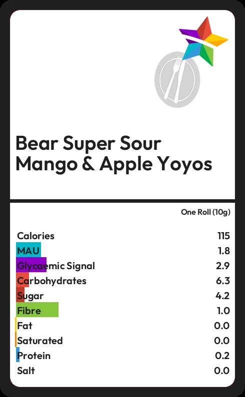 Bear Super Sour Mango & Apple Yoyos contains 4.2g sugar in one Roll (10g) - that is around 1 cube of sugar.