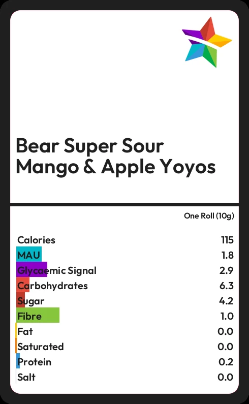 Bear Super Sour Mango & Apple Yoyos contains 4.2g sugar in one Roll (10g) - that is around 1 cube of sugar.