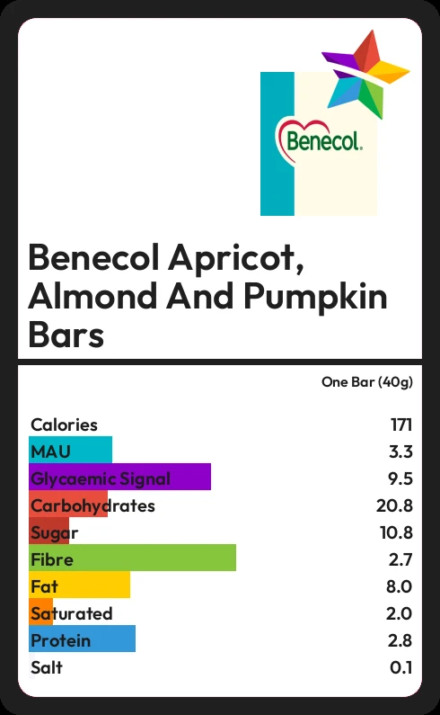 Benecol Apricot, Almond And Pumpkin Bars contains 171.2 calories in one Bar (40g).