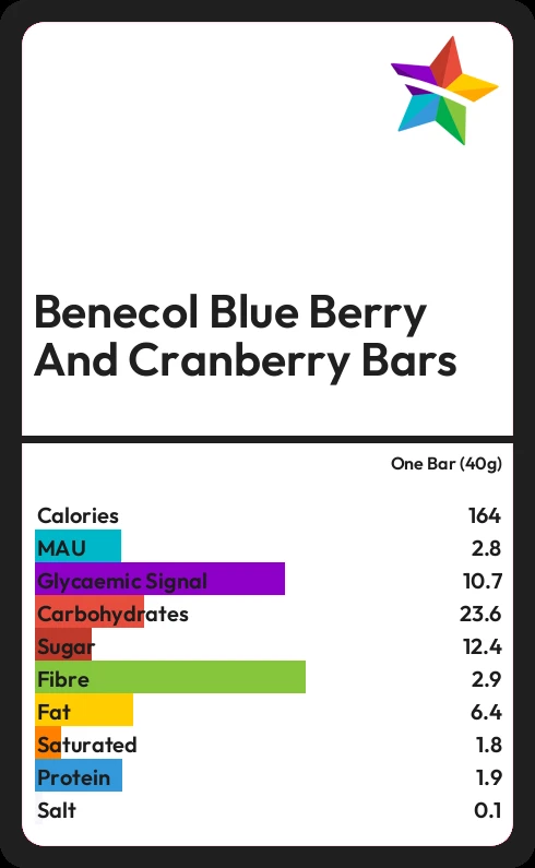 Benecol Blue Berry And Cranberry Bars contains 164.4 calories in one Bar (40g).