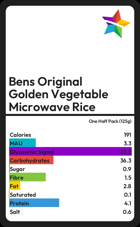 Bens Original Golden Vegetable Microwave Rice contains 0.9g sugar in one Half Pack (125g)