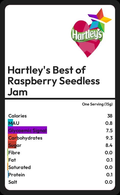 Hartley's Best of Raspberry Seedless Jam contains 8.4g sugar in one Serving (15g) - that is around 2 cubes of sugar.