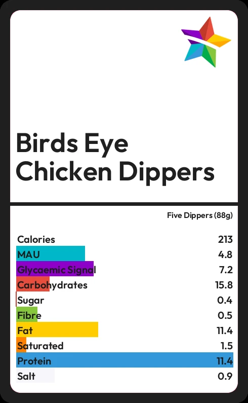 Birds Eye Chicken Dippers contains 0.4g sugar in five Dippers (88g)