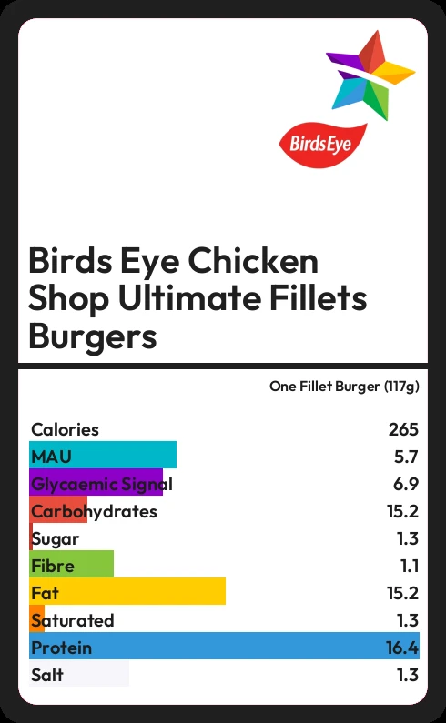 Birds Eye Chicken Shop Ultimate Fillets Burgers contains 264.4 calories in one Fillet Burger (117g).
