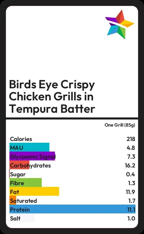 Birds Eye Crispy Chicken Grills in Tempura Batter contains 0.4g sugar in one Grill (85g)