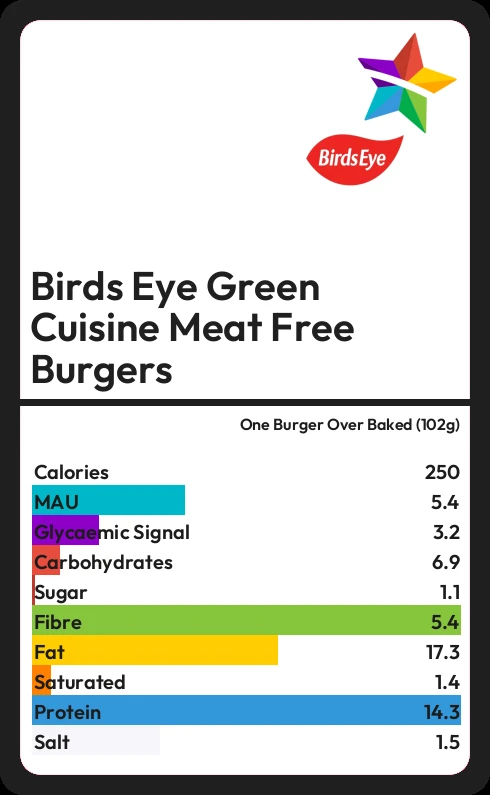 Birds Eye Green Cuisine Meat Free Burgers contains 1.1g sugar in one Burger Over Baked (102g)