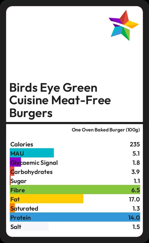 Birds Eye Green Cuisine Meat-Free Burgers contains 1.1g sugar in one Oven Baked Burger (100g)