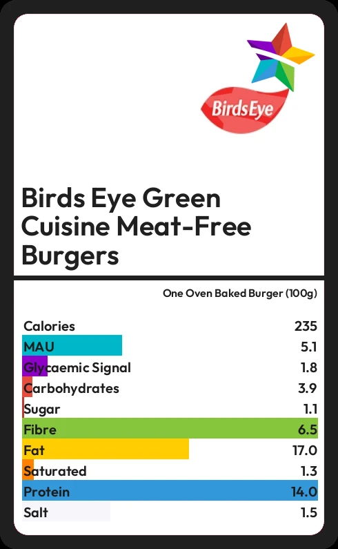 Birds Eye Green Cuisine Meat-Free Burgers contains 1.1g sugar in one Oven Baked Burger (100g)