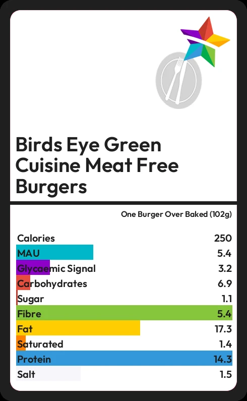 Birds Eye Green Cuisine Meat Free Burgers contains 1.1g sugar in one Burger Over Baked (102g)