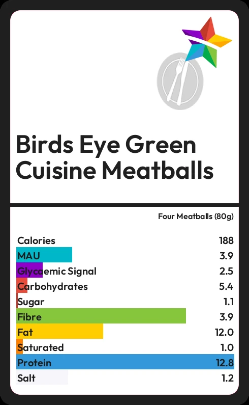 Birds Eye Green Cuisine Meatballs contains 1.1g sugar in four Meatballs (80g)