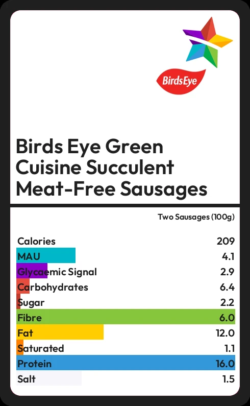 Birds Eye Green Cuisine Succulent Meat-Free Sausages contains 209 calories in two Sausages (100g).