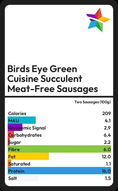 Birds Eye Green Cuisine Succulent Meat-Free Sausages contains 209 calories in two Sausages (100g).