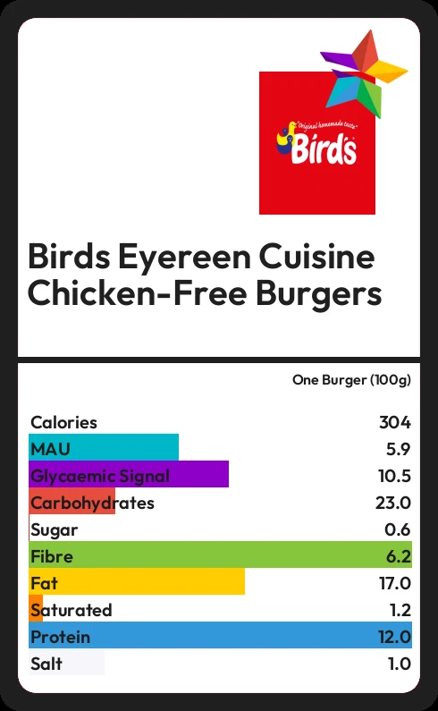 Birds Eyereen Cuisine Chicken-Free Burgers contains 0.6g sugar in one Burger (100g)