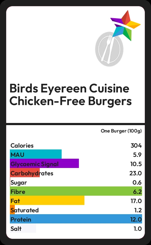 Birds Eyereen Cuisine Chicken-Free Burgers contains 0.6g sugar in one Burger (100g)