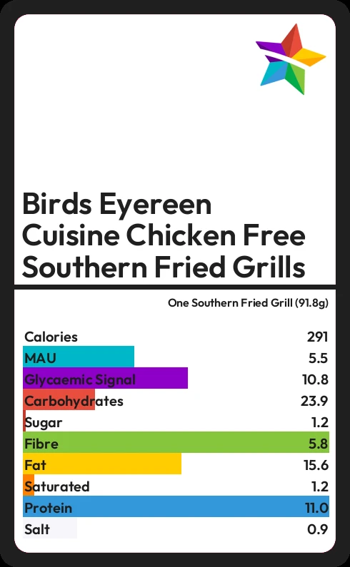 Birds Eyereen Cuisine Chicken Free Southern Fried Grills contains 1.2g sugar in one Southern Fried Grill (91.8g)