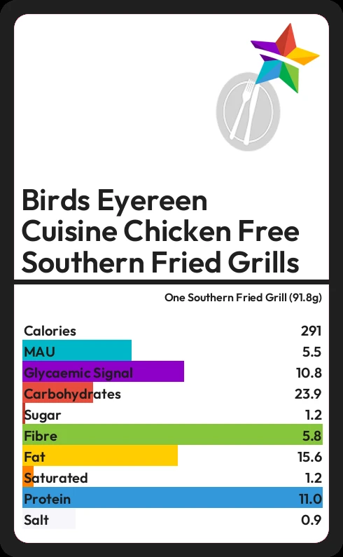 Birds Eyereen Cuisine Chicken Free Southern Fried Grills contains 1.2g sugar in one Southern Fried Grill (91.8g)