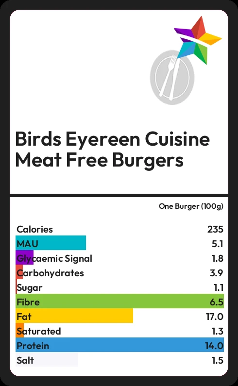 Birds Eyereen Cuisine Meat Free Burgers contains 1.1g sugar in one Burger (100g)