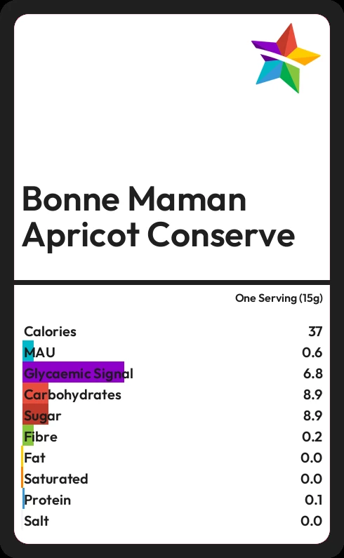 Bonne Maman Apricot Conserve contains 36.8 calories in one Serving (15g).