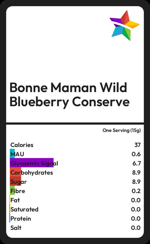 Bonne Maman Wild Blueberry Conserve contains 8.9g sugar in one Serving (15g) - that is around 2 cubes of sugar.
