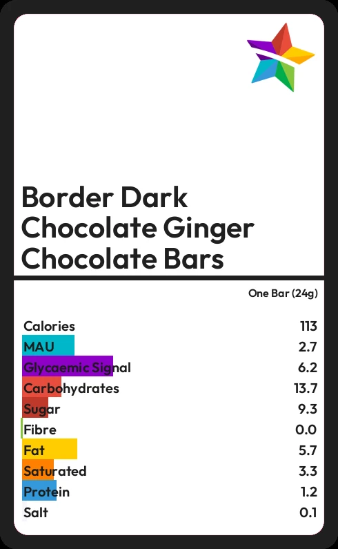 Border Dark Chocolate Ginger Chocolate Bars contains 112.8 calories in one Bar (24g).