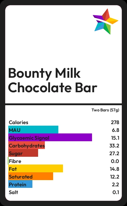 Bounty Milk Chocolate Bar contains 277.6 calories in two Bars (57g).