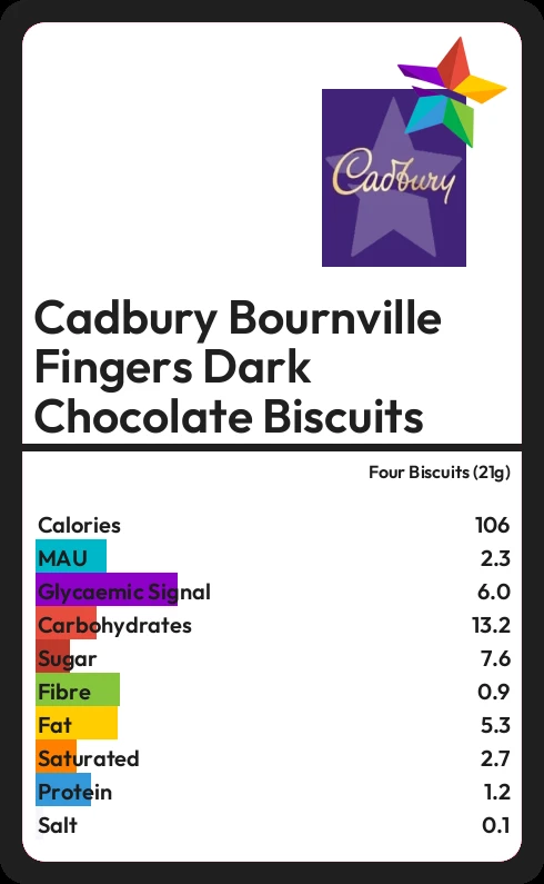 Cadbury Bournville Fingers Dark Chocolate Biscuits contains 106.1 calories in four Biscuits (21g).