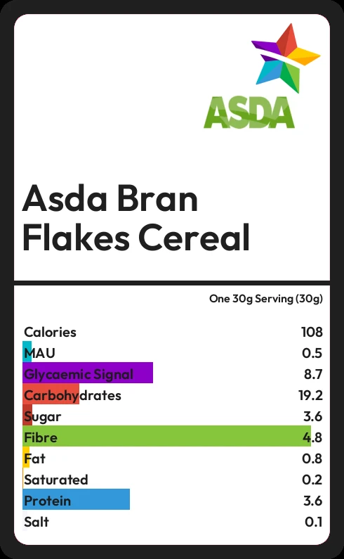 Asda Bran Flakes Cereal contains 108 calories in one 30g Serving (30g).