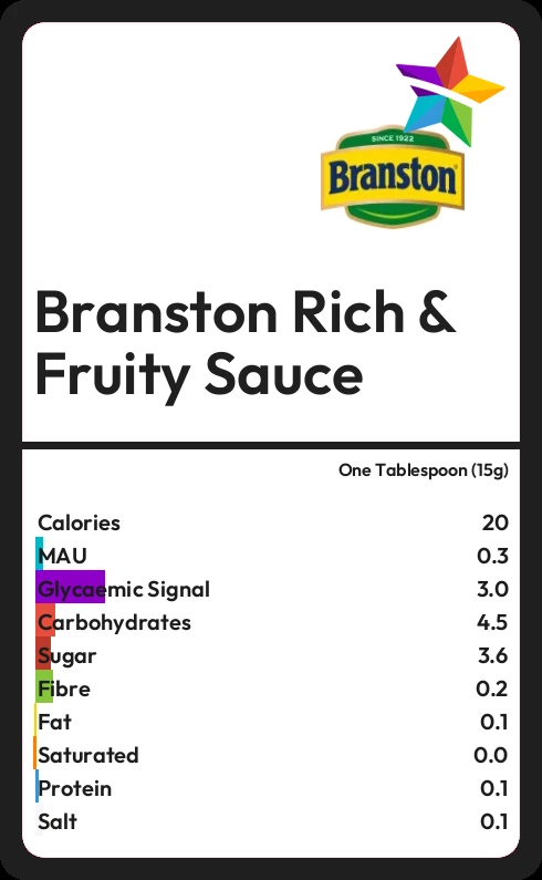 Branston Rich & Fruity Sauce contains 20.4 calories in one Tablespoon (15g).