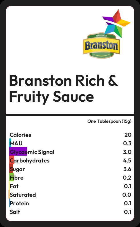 Branston Rich & Fruity Sauce contains 20.4 calories in one Tablespoon (15g).