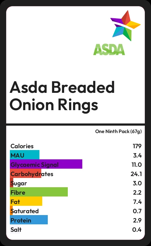 Asda Breaded Onion Rings contains 178.9 calories in one Ninth Pack (67g).