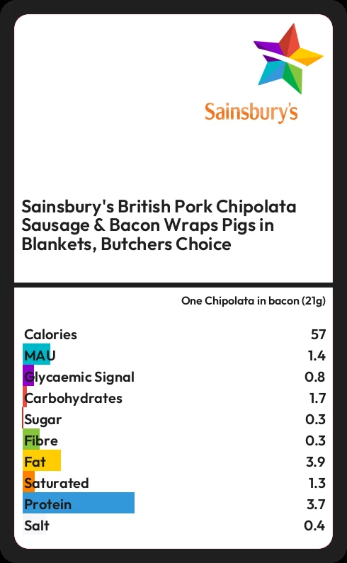 Sainsbury's British Pork Chipolata Sausage & Bacon Wraps Pigs in Blankets, Butchers Choice contains 57.1 calories in one Chipolata in bacon (21g).