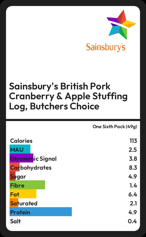 Sainsbury's British Pork Cranberry & Apple Stuffing Log, Butchers Choice contains 112.7 calories in one Sixth Pack (49g).