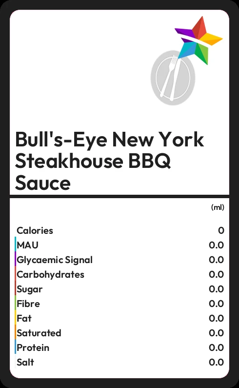 In 100ml of Bull's-Eye New York Steakhouse BBQ Sauce there are 0.6g of fat of which none are saturated.