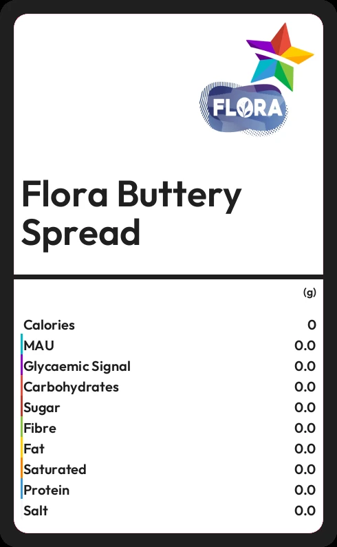 Flora Buttery Spread contains 0.6g sugar in 100g