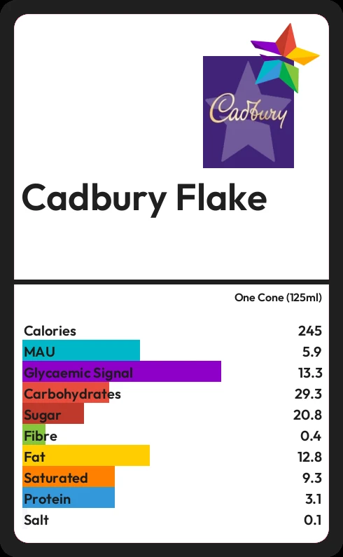 Cadbury Flake contains 20.8g sugar in one Cone (125ml) - that is around 5 cubes of sugar.