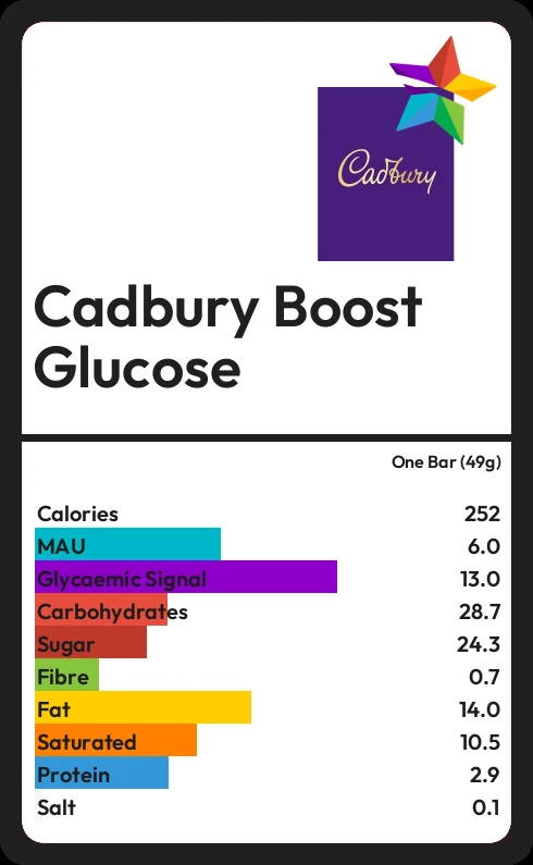 Cadbury Boost Glucose contains 24.3g sugar in one Bar (49g) - that is around 6 cubes of sugar.