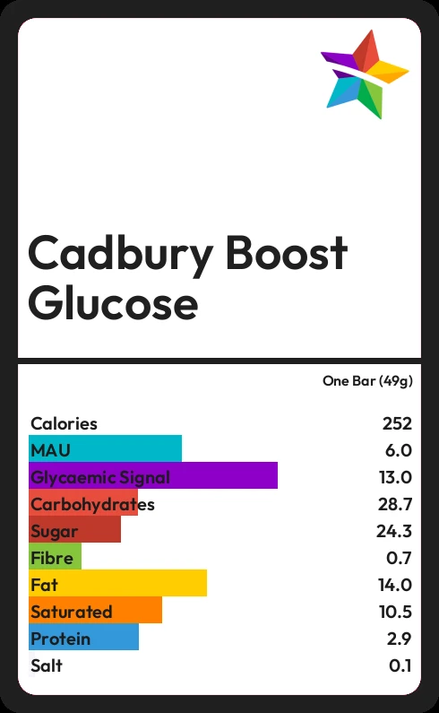Cadbury Boost Glucose contains 24.3g sugar in one Bar (49g) - that is around 6 cubes of sugar.