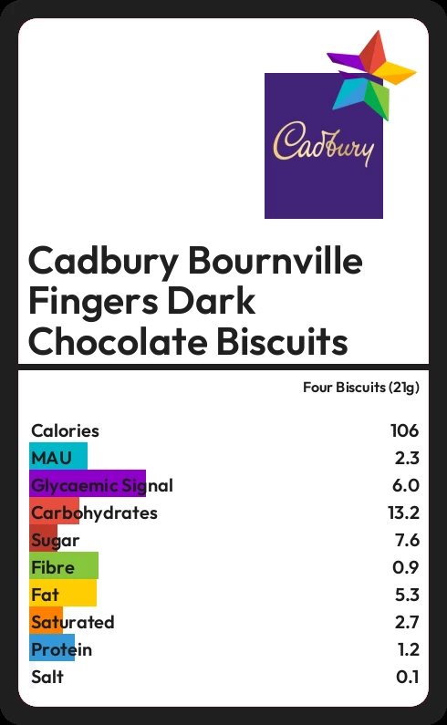 Cadbury Bournville Fingers Dark Chocolate Biscuits contains 106.1 calories in four Biscuits (21g).