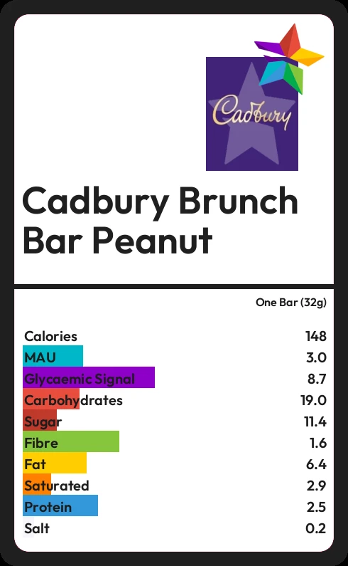 Cadbury Brunch Bar Peanut contains 11.4g sugar in one Bar (32g) - that is around 3 cubes of sugar.